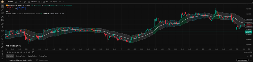 The Snapfront Coherence Bands overlay price action with φ²-driven adaptive bands that expand and contract with market entropy. Unlike static Bollinger Bands, these are built from coherence math (WCTφ), showing not just volatility but the order/chaos balance of the market in real time.