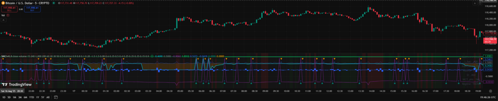 - 🟩 Bull Signals / 🟥 Bear Signals: Auto-generated arrows when coherence + trend alignment confirm momentum shifts.